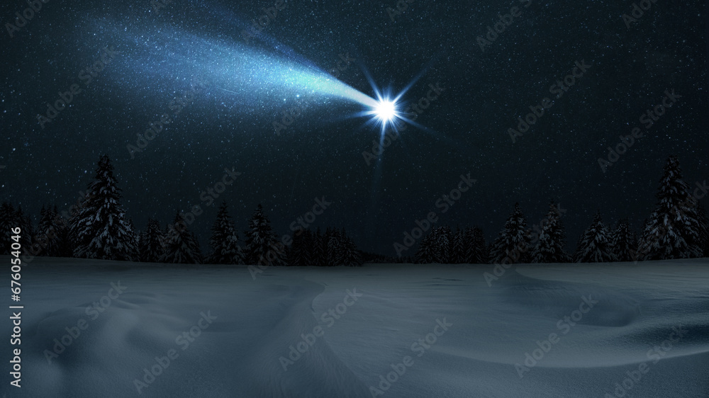 Christmas night. The first star lit up in the winter forest with snow and the night starry sky. Christmas Eve concept. Comet falls in the starry night sky 2024