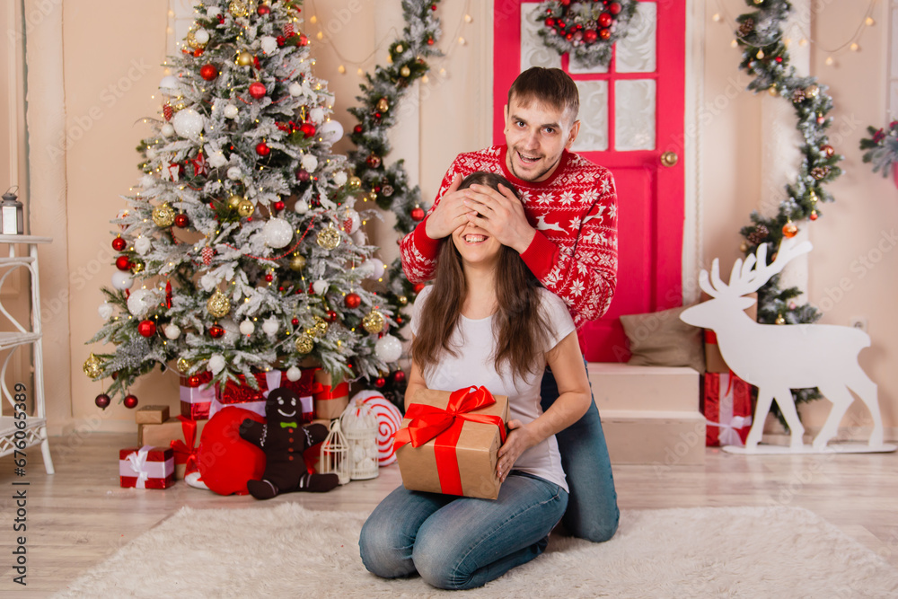 A beautiful couple on a Christmas background gives each other gifts. Young man and woman are preparing for the holiday.