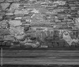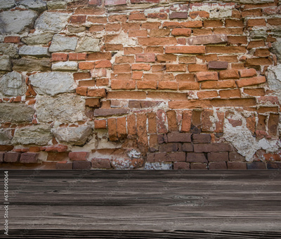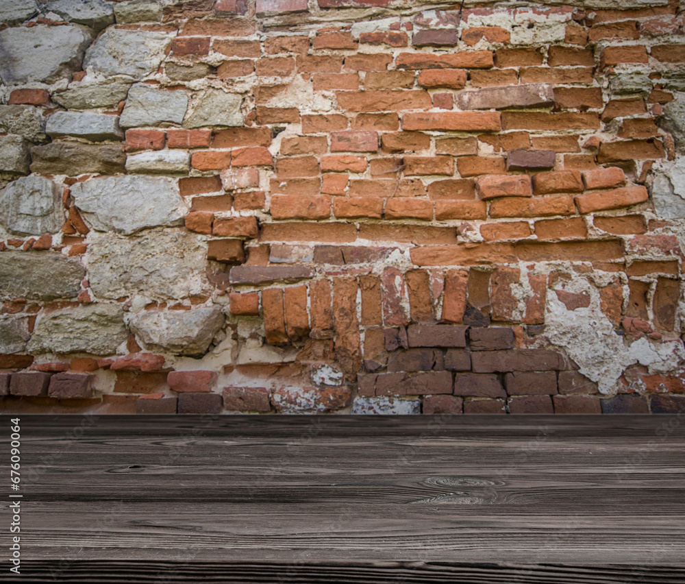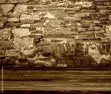 Stone brick walls and wooden floor for mock up. Rustic old wooden planks, shelf or table surface. Empty room background for product displaing and copy space for text