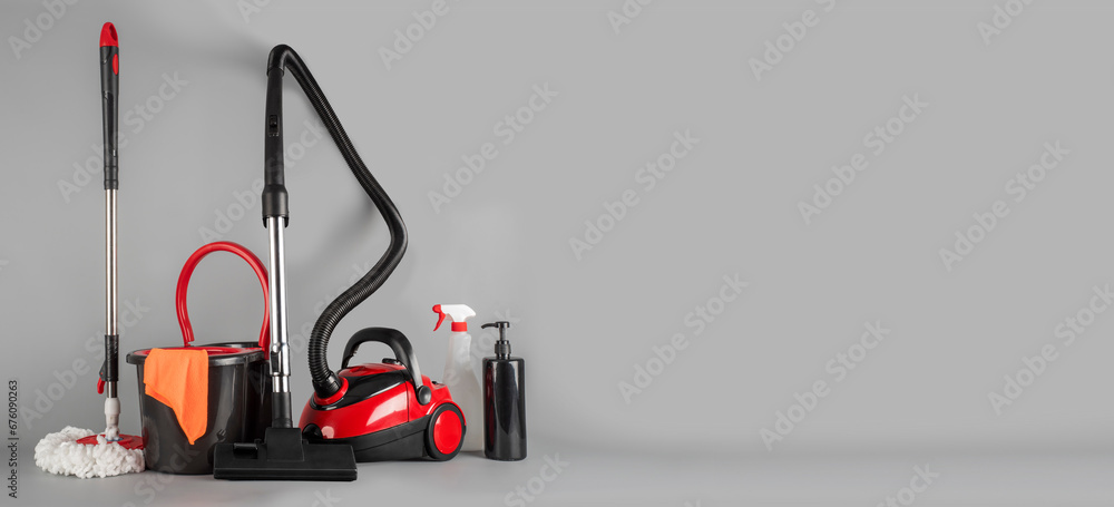 Cleaning concept mop and bucket, vacuum cleaner. Cleaning products and spin mop with red details on the floor in the grey background