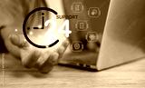 The technician hand holding icon of 24 hours and call center symbol on screen. Technical support service, question, information center or chat with staff. Care and consulting client 24hr.