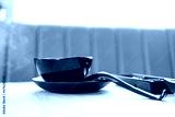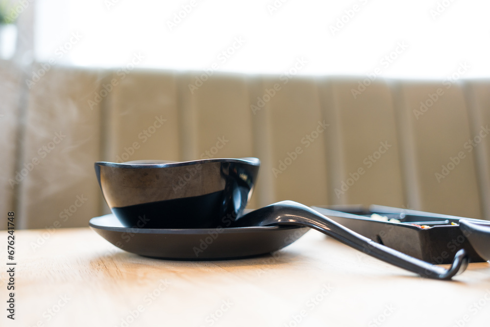 Black bowl for Shabu and sukiyaki or hot pot on wood black. Close up