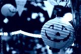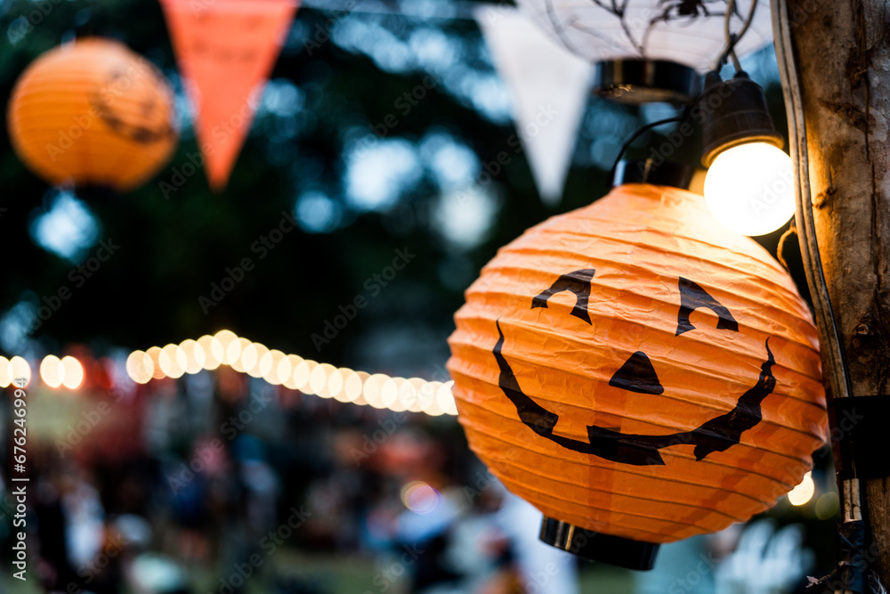 Halloween paper lantern hanging with lights. Holiday decorations for Halloween