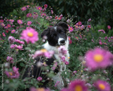 Cute puppy sitting among the pink flowers and looking at camera. Black and white border collie on blossoming meadow . High quality horizontal photo