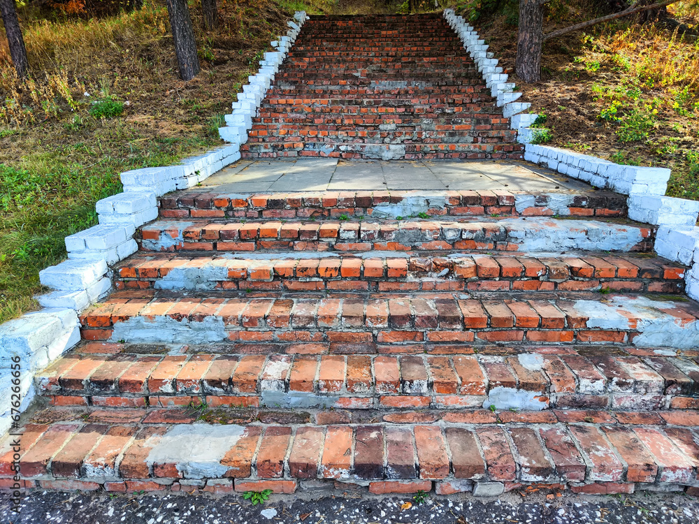 Red brick stairs. Old vintage texture stairway. Grey Grunge blocks stairs in park. Background and location