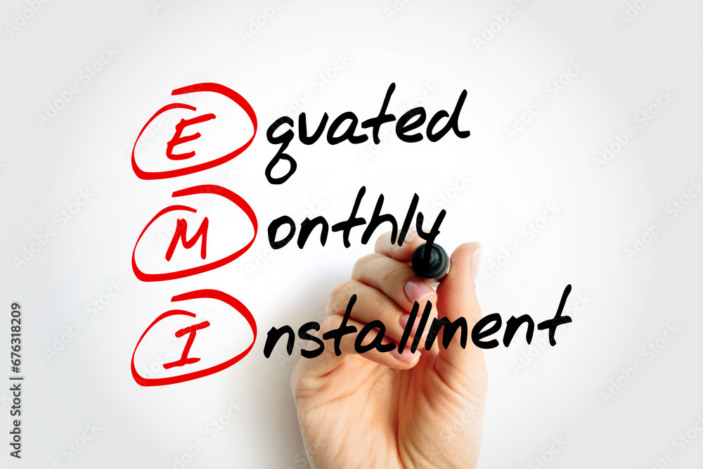 EMI Equated Monthly Installment - fixed payment amount made by a borrower to a lender at a specified date each calendar month, acronym text concept background