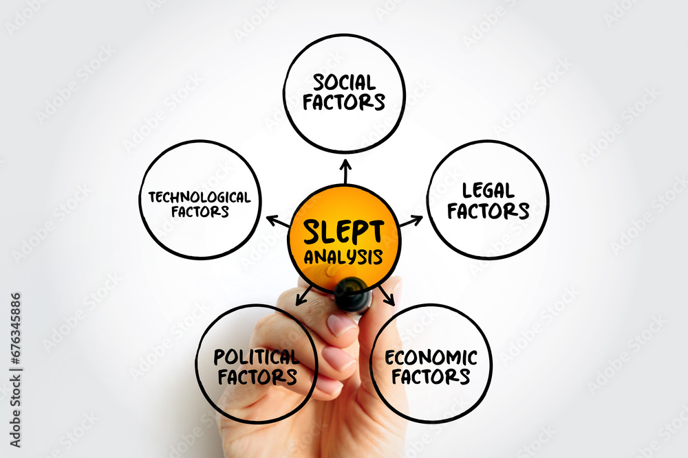 SLEPT analysis is a framework to assess an organization’s external environmental influence on it, mind map concept for presentations and reports