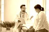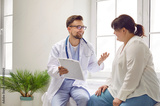 Portrait of fat overweight female patient in medical office listening to a friendly doctor holding report file with appointment and giving consultation a woman during medical examination in clinic.