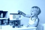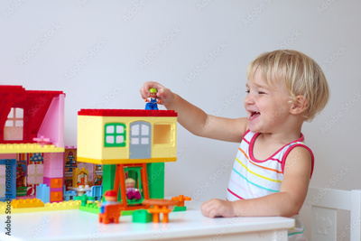 Happy preschooler girl building house from plastic blocks