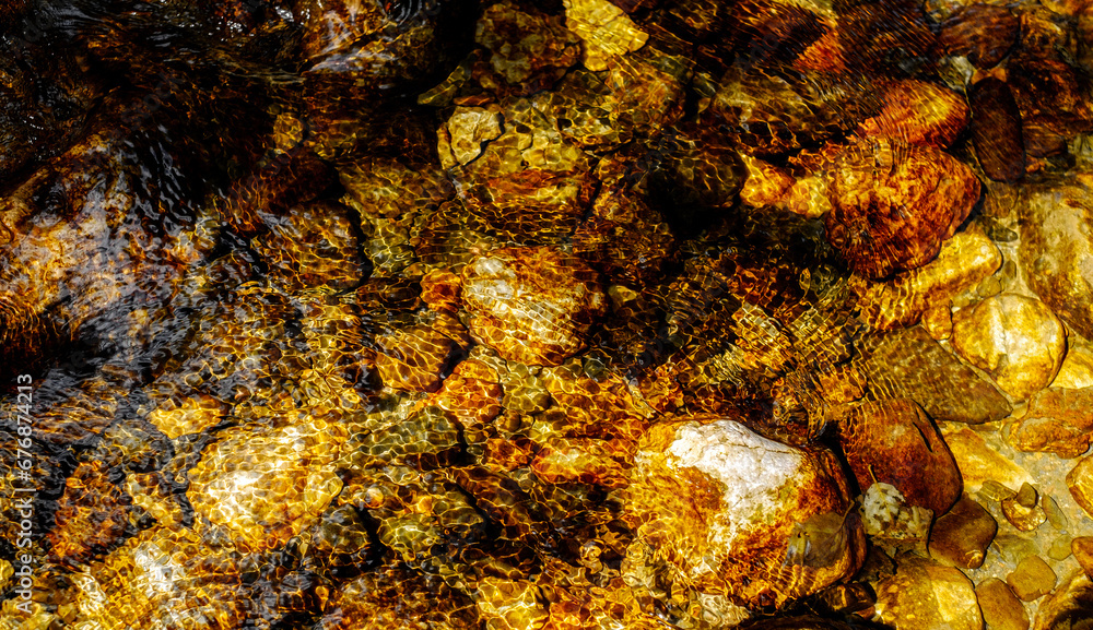 golden rocks under crystal clear water