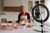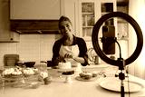 Happy female confectioner decorating cake on the kitchen while filming the process on smart phone