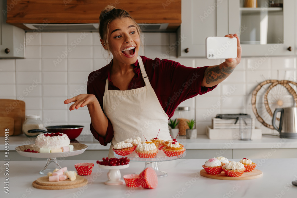 Happy female baker using smart phone while making selfie with various sweet food laying on the table