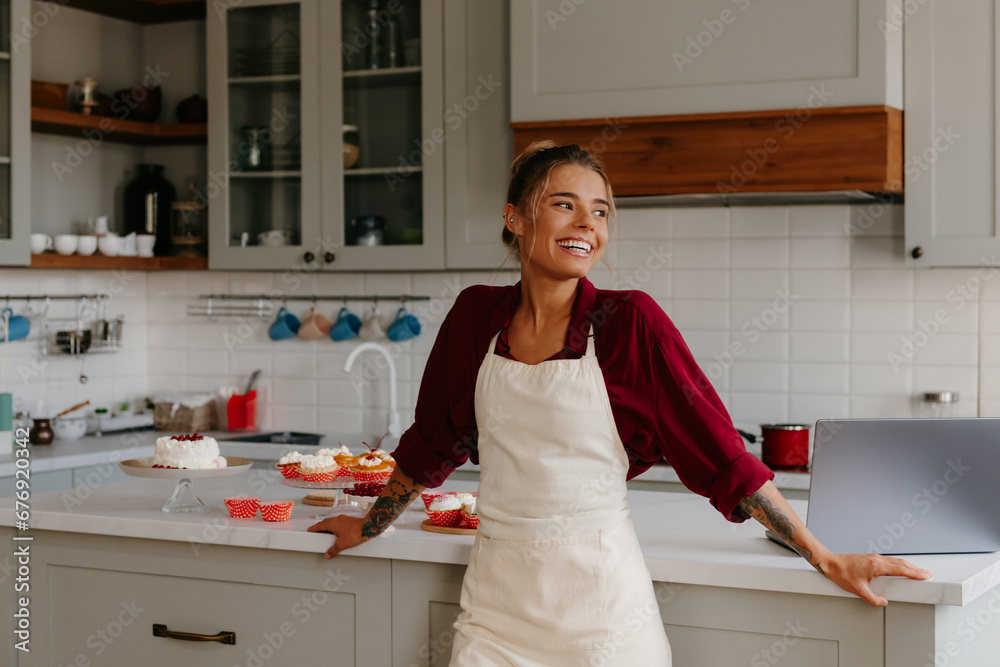 Beautiful female baker looking happy while leaning at the kitchen island with variety of sweet food