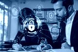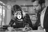 Businesspeople in formal wear taking notes signing contract at office workplace. Concept of important working moments, document sign, working process, concentration. Lock hologram