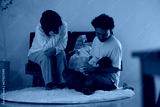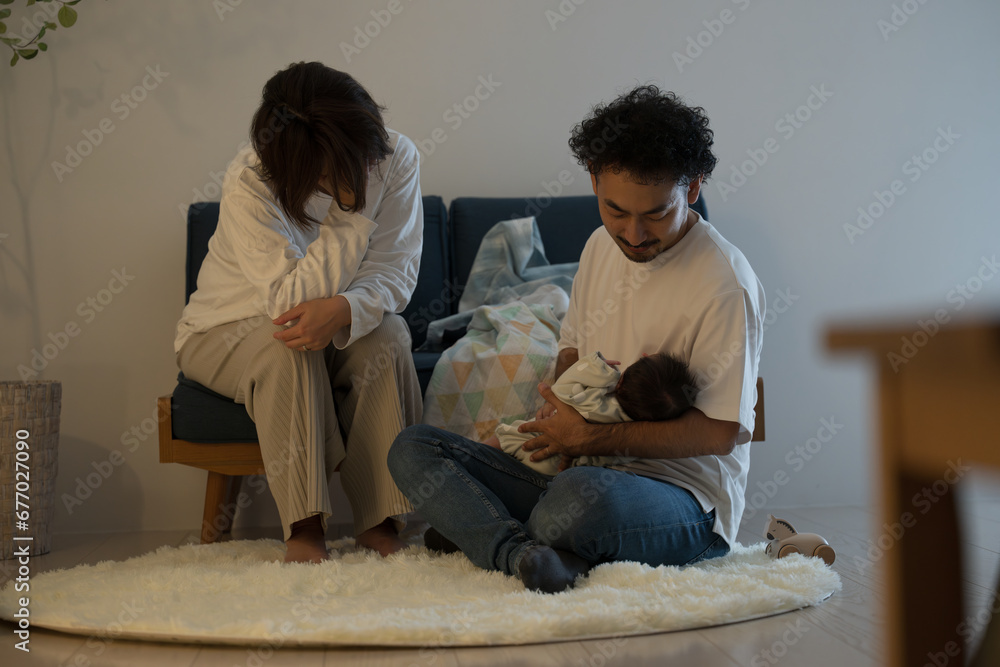 赤ちゃんの夜泣き対応をする疲れた夫婦 泣き止まない