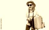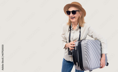 Travel old woman hold baggage Old lady going to travel on holiday Retired woman look at blank space Tourist travel abroad in free time rest getaway Air flight trip journey weekend holiday concept