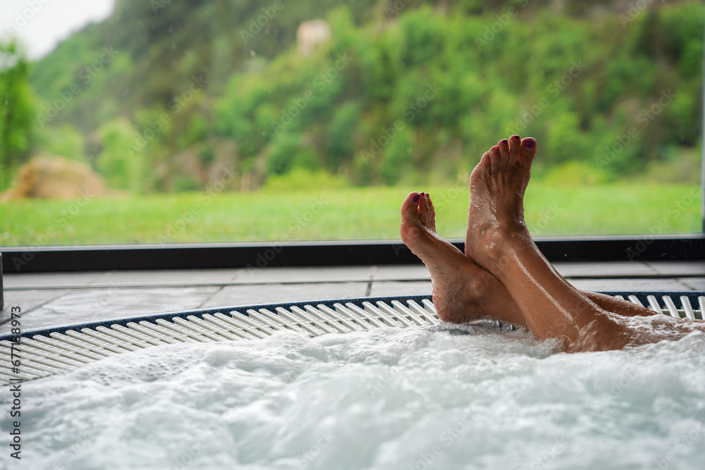 Feet in a jacuzzi in a winter scene in vacations in resort. Wellness and therapeutic relaxation in a spa in the mountains.