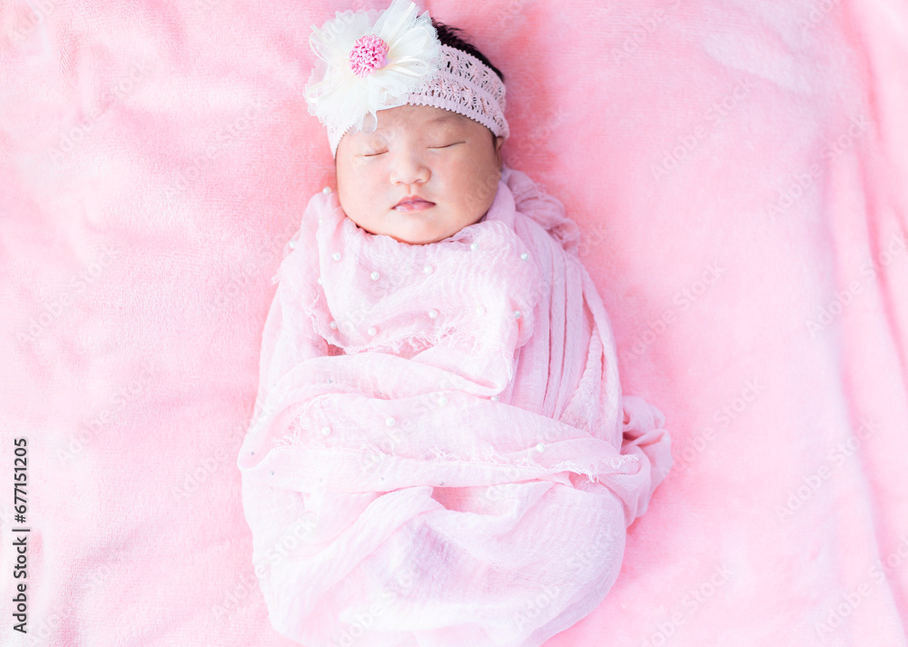 Newborn baby,Close-up beautiful sleeping baby boy. Newborn baby sleeping on a blanket, beautiful pictures, seven days, newborn baby wearing large cloth, cloth rose headband.