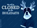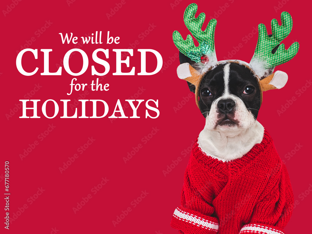 Signboard with the inscription We will be closed for the Holidays. Cute puppy. Closeup, indoors. Studio shot. Pets care concept