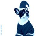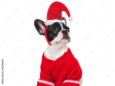 Lovable puppy and knitted sweater with Christmas patterns. Close-up, indoors. Day light, studio shot. Congratulations for family, relatives, loved ones, friends and colleagues. Pets care concept