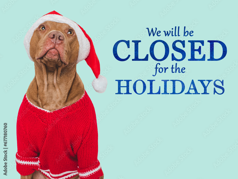 Signboard with the inscription We will be closed for the Holidays. Cute dog and red knitted sweater. Closeup, indoors. Studio shot. Pets care concept