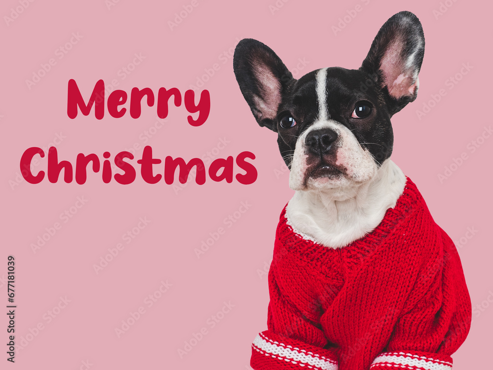 Merry Christmas. Lovable puppy and Santa Claus costume. Close-up, indoors. Day light, studio shot. Isolated. Congratulations for family, relatives, loved ones, friends and colleagues. Pet care concept