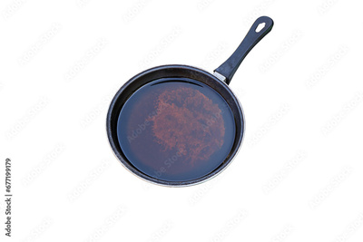 Rusted round cast iron pan and old vegetable oil Isolated on white background. Do not use an old rusty pan. Because it can cause health problems. PNG