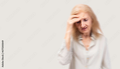 Tired faint senior adult old woman suffering from strong chronic headache migraine or memory loss Elderly grandmother get stressed dizzy fatigued Senior woman get pain in aching head She get stressed