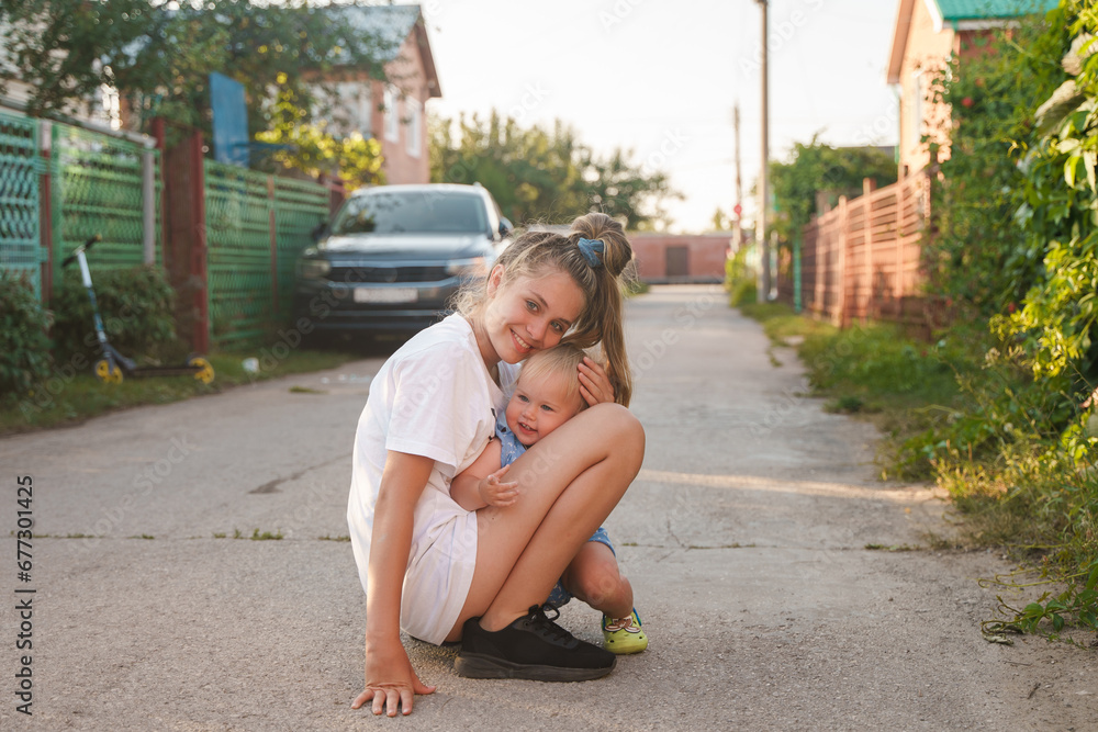 Charming baby toddler and older teenage sister hug on a street between private houses outside the city, green summer in the village