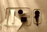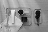 Minimalist creative background for cosmetics or products presentation with coffee ingredient. Plastic tube and amber jar displayed on tray with beans and powder of coffee on wooden background