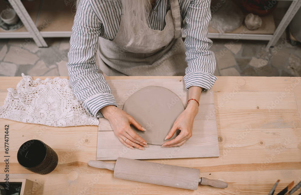 Female hands working with clay makes ceramic tableware on pottery workshop.