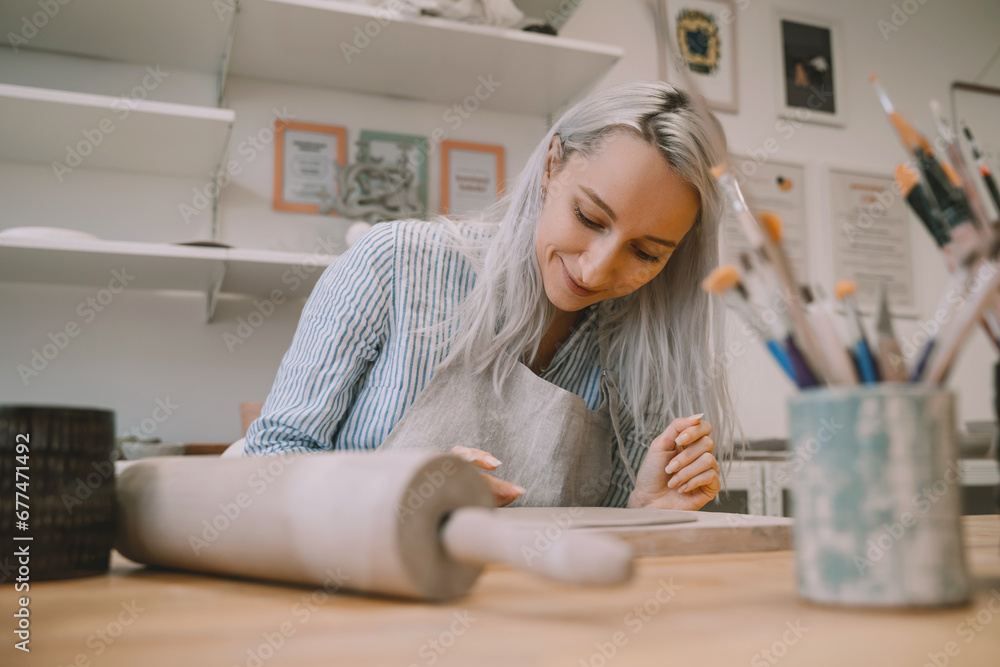 Woman creating clay product on ceramics workshop in art studio. Craftsperson on pottery workshop.