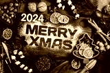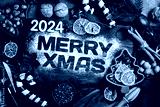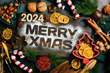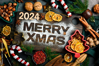 Merry Christmas - Kitchen Christmas food background with an inscription. New Year and Christmas decorations and kitchen appliances. Top view. Flat lay.