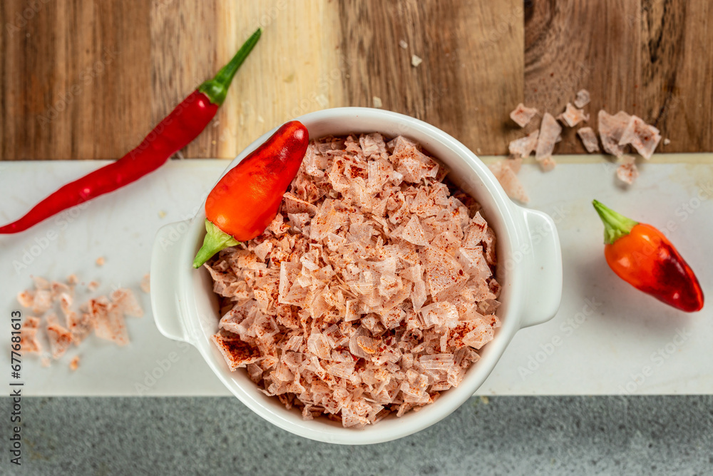 sea salt Red chilli pepper. Menu, recipe mock up, banner. copy space for text. top view
