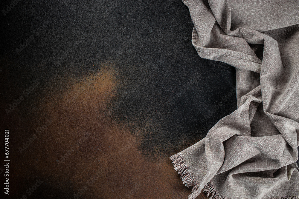 a towel on the kitchen table, cook background, on a dark background. top view. copy space for text