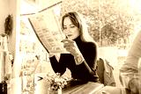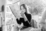 Young woman reading menu sitting with friend at casual cafe. Smiling woman checking menu, choosing meal or drink, making order. Try new foods while traveling. real people. copy space. Selective focus.