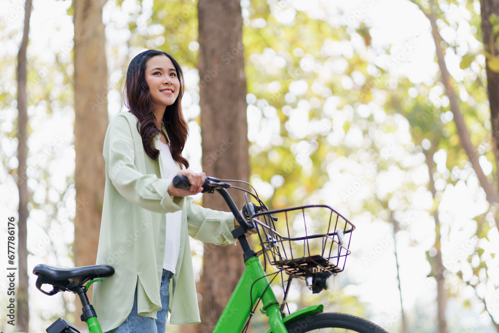 Healthy wellbeing lifestyle, Young asian female riding bicycle at public park.