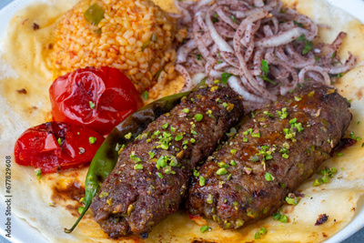 Traditional delicious Turkish cuisine, kebab type belonging to Adana and Antep regions, grilled pistachio kebab. Turkish name; fistikli kebab