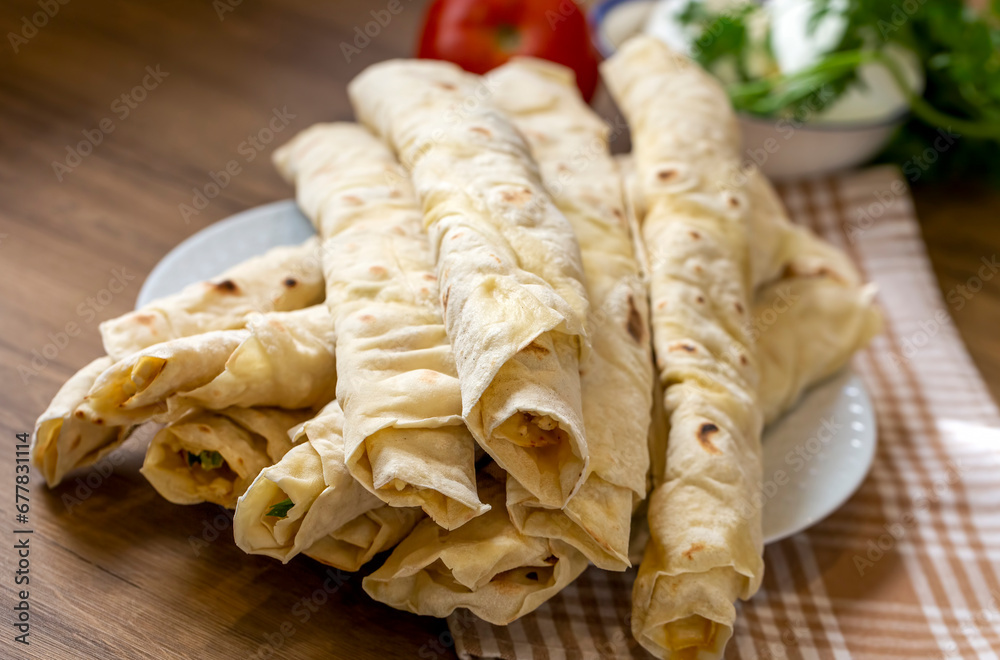 Traditional, local Turkish food; cheese pastry wrap (Turkish name; Sikma)