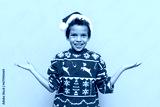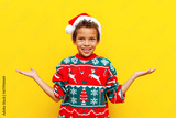 african american boy in christmas sweater and santa hat holds empty hands on yellow isolated background