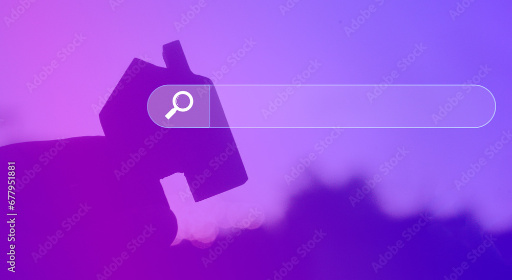 Man holding wood home with icon searching information website for home search, land price, property tax. Real estate online concept