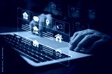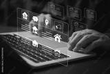 Real estate concept business, home insurance and real estate protection. Buy and sell houses and online commercial enterprises, residential realty assets.on a virtual screen..