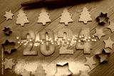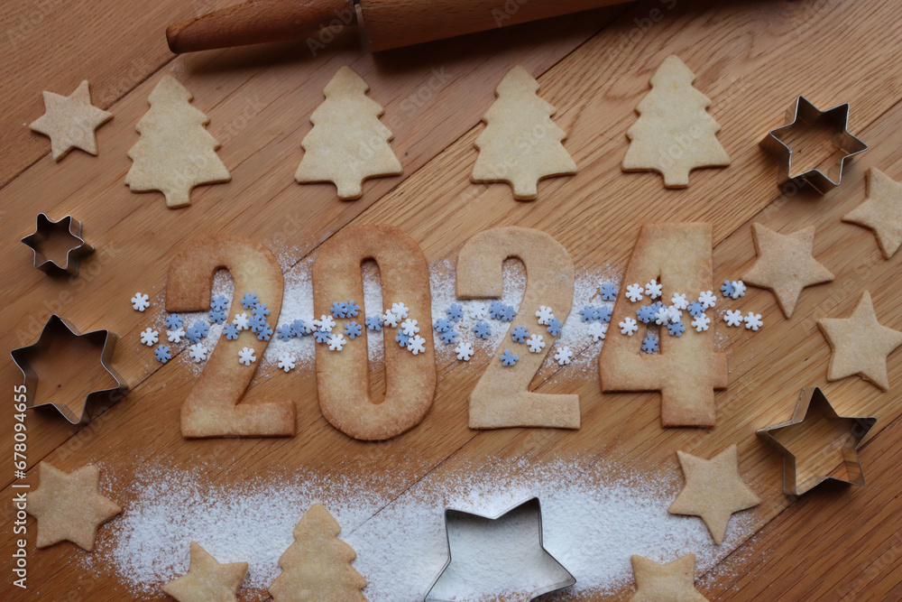 Shortcrust cookies with blue and white snowflake sprinkles in the form of numbers 2024 with cookie cutters and rolling pin on wooden table