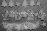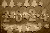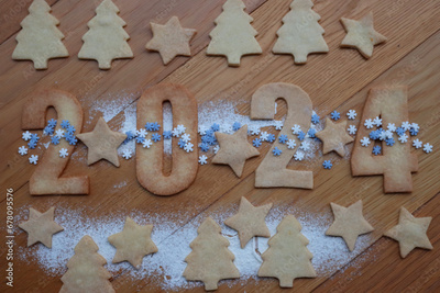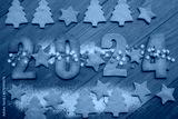 Shortcrust cookies with blue and white snowflake sprinkles in the form of numbers 2024 on wooden table