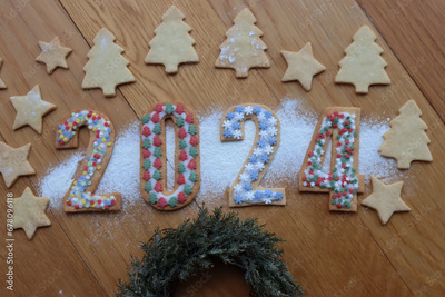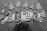 Shortcrust cookies with colorful sprinkles in the form of numbers 2024 with pine garlands and ornaments on wooden table