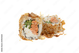 Cheap version of sushi rolls on a white background. Japanese food of rice and tuna and Philadelphia cheese rolled in dry fish.