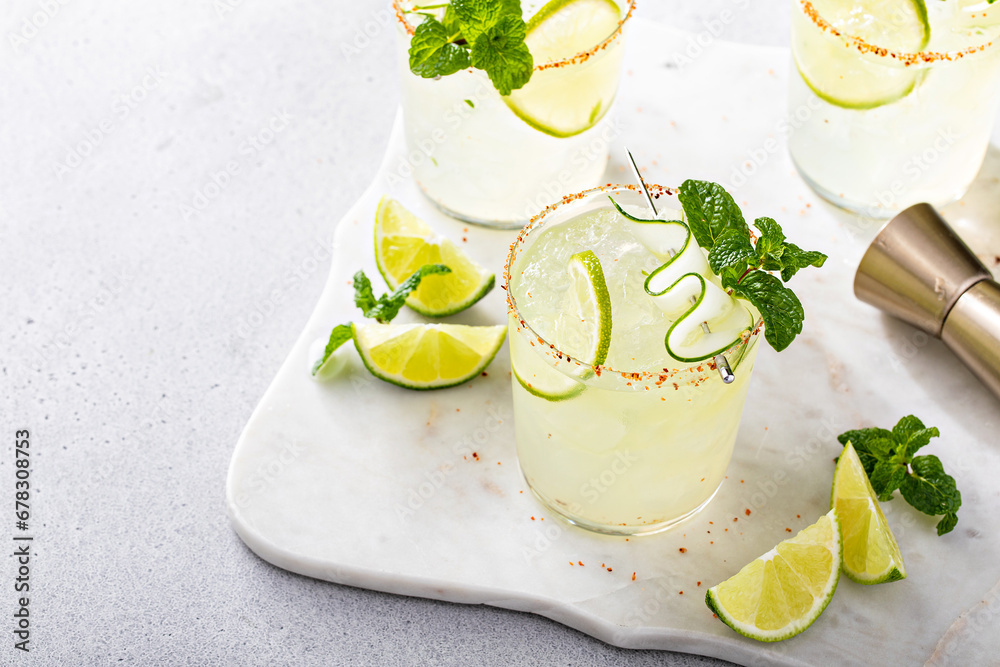 Cucumber and lime spicy margarita with chili powder on rim