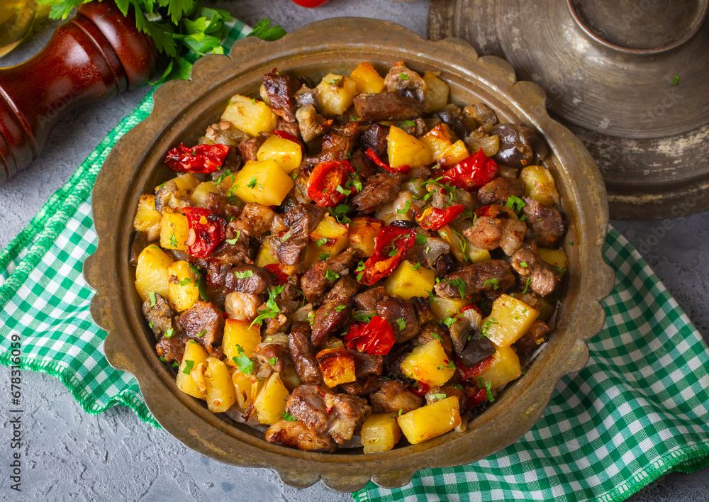 From Turkish cuisine; meat, vegetable kebab, casserole. Turkish name; Maras Tava or Kahramanmaras Tava - Orman Kebabi