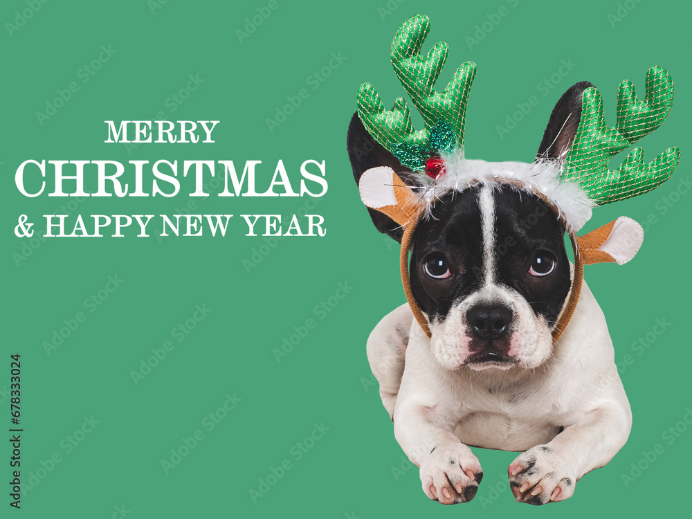 Signboard with the inscription We will be closed for the Holidays. Cute puppy. Closeup, indoors. Studio shot. Pets care concept