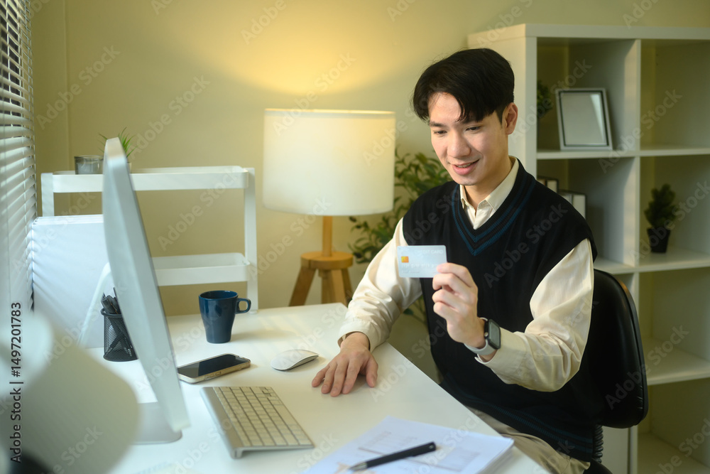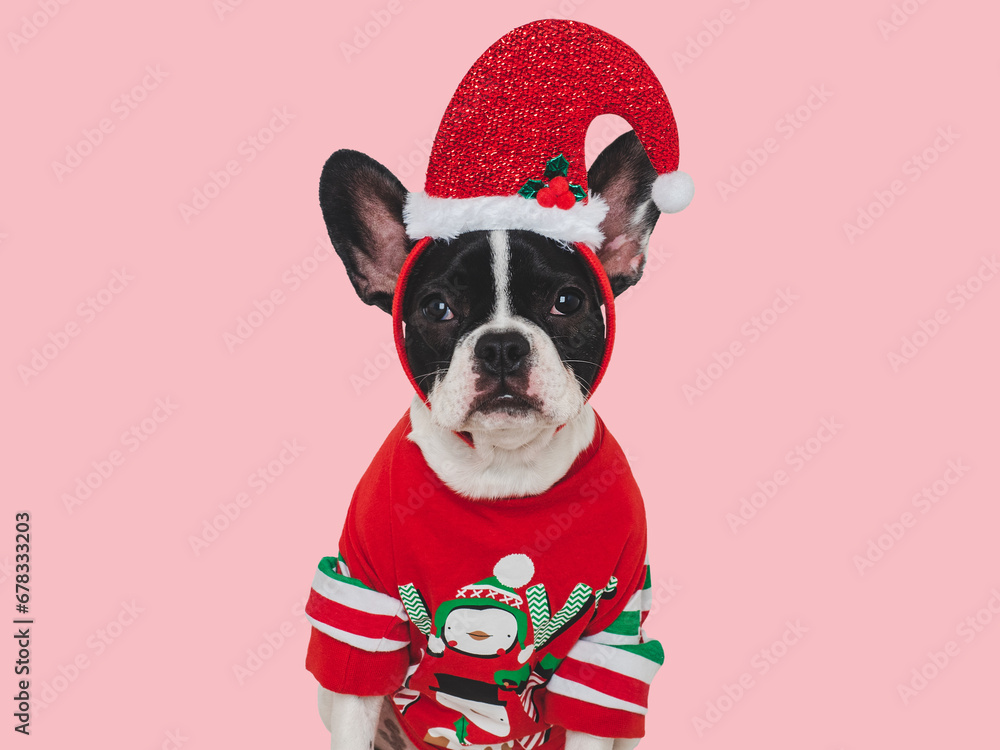 Lovable puppy and knitted sweater with Christmas patterns. Close-up, indoors. Day light, studio shot. Congratulations for family, relatives, loved ones, friends and colleagues. Pets care concept